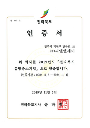 有前途的中小企业认证书(全罗北道)